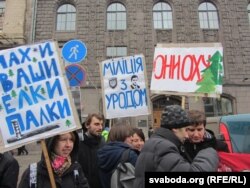 Вось гэтыя студэнты і актывісты стаяць асобным пікетам з плякатамі кшталту «Міліцыя з уродам».