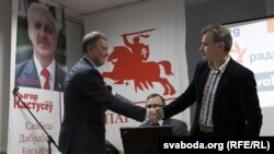 У кнізе Анатоля Лябедзькі ёсьць бліскучыя словы „Я хутчэй адгрызу уласную руку, чым адмоўлюся ад таго, у што веру“. Дайце паціснуць гэтую руку» — кажа Аляксандар Лукашук, і цісьне руку Анатолю Лябедзьку.