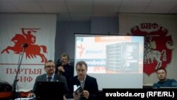 Прысутныя на прэзэнтацыі глядзяць тое (ужо даволі вядомае) відэа, на якім Анатоль Лябедзька ў менскім офісе Радыё Свабода дэманструе на журналісьце Беларускай Свабоды Алегу Грузьдзіловічу, як ахоўнікі абыходзяцца зь вязьнямі