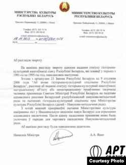 У адказе гаворыцца, што па выніках разгляду звароту адносна наданьня статусу гісторыка-культурнай каштоўнасьці сьцягу Рэспублікі Беларусь, які існаваў у пэрыяд з 1991-га па 1995-ты год, з мэтай якаснай прапрацоўкі пытаньня Міністэрствам культуры накіраваны ліст у Нацыянальную акадэмію навук Беларусі для атрыманьня адпаведнага заключэньня. Пасьля адказу пададзеная прапанова можа быць уключаная ў парадак дня чарговага пасяджэньня Навукова-мэтадычнай рады.