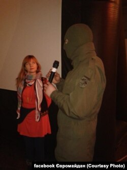 На паказе прысутнічалі дзясяткі байцоў у масках, у тым ліку беларускія актывісты, якія прыехалі падтрымаць Эўрамайдан.