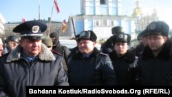 Каля ста міліцыянтаў са Львова прыехалі на Міхайлаўскую плошчу на аўтобусе. Большасьць службоўцаў у форме, некаторыя ў цывільным. Міліцыянты маюць розныя званьні, сярод іх адстаўнікі і воіны-аўганцы.