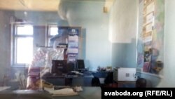 Адзін пакой усё ж зачынены, і там праз шкло відаць стары тэлефонны апарат, газэту «Беларусь Сегодня», тэчкі, накладныя, маніторы, прынтар.