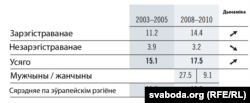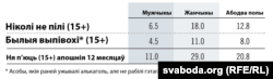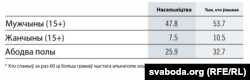 Узровень спажываньня чыстага сьпірту на аднаго жыхара Беларусі, старэйшага за 15 гадоў, складае 17,5 літра. Мужчыны выпіваюць у год 27,5 літра чыстага сьпірту, жанчыны — 9,1 літра.