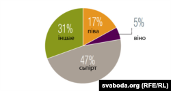 Беларусы часьцей за ўсё спажываюць моцныя напоі: больш за 47% спажытага алькаголю прыпадае на гарэлку і іншы моцны алькаголь; 17% — на піва; 5% — на вінаграднае віно. Астатнія 31% — іншыя напоі, у тым ліку алькагольныя і піўныя кактэйлі, мацаванае пладова-ягаднае віно, а таксама самагон.