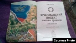 У адным зь менскіх праваслаўных храмаў прадаецца дзіцячая кніжка-расфарбоўка «Христианский подвиг нашего времени» з намаляванымі салдатамі ў расейскай форме і са зброяй у руках.