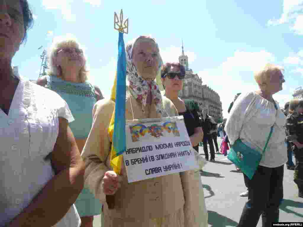 Сёньня зраніцы, перад плянаваным народным вечам на Майдане Незалежнасьці, ля сьценаў Адміністрацыі Прэзыдэнта Ўкраіны адбылася акцыя пратэсту супраць нерашучасьці ўлады ў барацьбе супраць тэрарыстаў на ўсходзе краіны. Некалькі тысячаў грамадзянаў, а таксама байцы спецбатальёну «Данбас» сабраліся, каб перадаць прэзыдэнту свае патрабаваньні. Выступы прадстаўніка Міністэрства ўнутраных справаў і прадстаўніка прэзыдэнта былі сустрэтыя агрэсіўна, людзі не давалі чыноўнікам гаварыць, заглушаючы крыкамі «Ганьба» і сьвістам. Пасьля перадачы патрабаваньняў прэзыдэнту, натоўп вырушыў на Майдан Незалежнасьці, дзе адбылося ўсенароднае веча. Патрабаваньні веча — тыя ж самыя: спыніць «перамір’е», якое — на думку ўдзельнікаў — не прыносіць ніякае карысьці, правесьці рашучыя ваенныя дзеяньні супраць баевікоў «тэрарыстычных» арганізацыяў. Акрамя таго, людзі не задаволеныя тым, што ў перамовах удзельнічае «шэры кардынал» часоў Кучмы і Януковіча, кум Пуціна — Віктар Медвядчук.