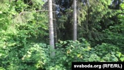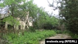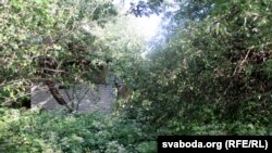 — Цяпер ужо ўсе за платамі пяцімэтровымі. А раней жа платоў не было. Толькі жэрдачкі. А цяпер каб вышэй, каб ніхто ня бачыў, што ты там робіш. Вось ён лазьню будаваў. Яшчэ ягоная цэгла ляжыць. Усё зарасло. Была сьцежка.