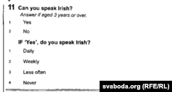 Вось блянк перапісу насельніцтва Ірляндзкай Рэспублікі. Там пасьля стагодзьдзяў уціску адраджаецца ірляндзкая гэльская (кельцкая) мова. Справа ідзе нялёгка, даводзіцца канкураваць з магутнай ангельскай мовай, якая выконвае функцыю глябальнага сродку камунікацыі (дарэчы, адрозна ад расейскай). Пра ангельскую дублінская анкета ўвогуле не пытае. Затое прапаноўвае пытаньні пра ірляндзкую: