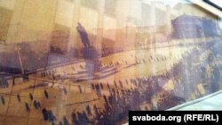 На адным зь іх — фота помніка Сталіну, які стаяў на гэтай плошчы, калі праспэкт Незалежнасьці насіў імя савецкага дыктатара. 10-мэтровы помнік Сталіну на цэнтральнай плошчы Менску быў адкрыты ў 1952 годзе. Зьнесьлі яго ў 1961-м пасьля разьвянчаньня культу Сталіна Хрушчовым.