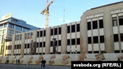Будынак, які разьбіраюць з дапамогай кранаў, абнесьлі палотнішчамі, на якіх набітыя віды Менску 20 стагодзьдзя.