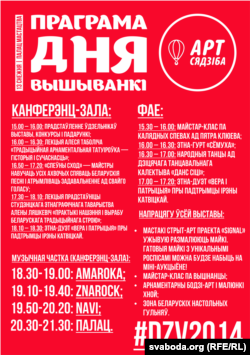 Зь 15.00 да 22.00 ў холе Палаца Мастацтва будзе працаваць выстава традыцыйных і сучасных вышыванак, адзеньня і сувэніраў ад папулярных моладзевых брэндаў, разнастайных вырабаў рамесьнікаў і майстроў, а ў гэты час у канфэрэнц-залі будуць праходзіць майстар-клясы, конкурсы, прэзэнтацыі ды музычныя выступы беларускіх гуртоў.