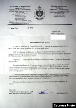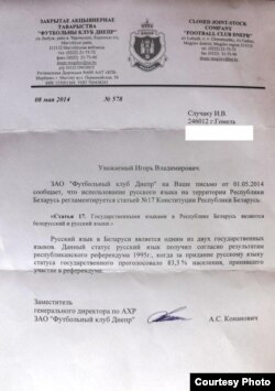 «ЗАО «Футбольный клуб «Днепр» на Ваше письмо сообщает, что использование русского языка на территории Республики Беларусь регламентируется статьей № 17 Конституции «Государственными языками в Беларуси являются русский и белорусский языки».