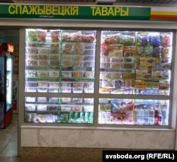 «Спажывецкія тавары» ад ««Ирже-Групп» аформленыя больш сьціпла. У самой краме можна заўважыць вядомую рэкляму «Зроблена ў Беларусі».