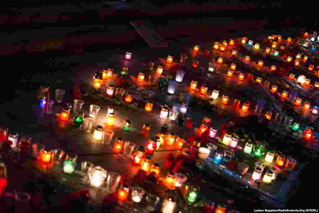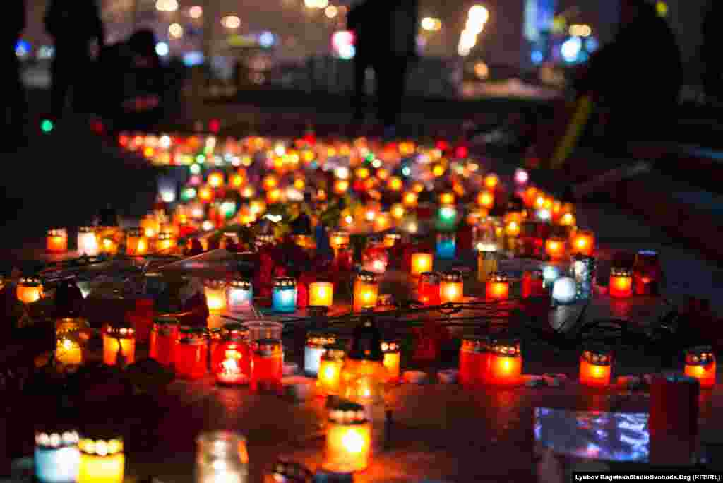 Кіяўляне пачалі прыходзіць на спантанны мітынг з 18:00 са сьвечкамі і кветкамі. І зараз на цэнтральнай плошчы сталіцы каля сотні неабыякавых грамадзян запальваюць лямпадкі па загінулых.