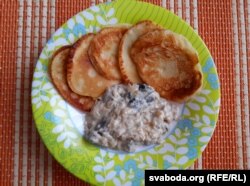 Ну, а цяпер смажым аладкі і падаём з нашай грыба-цыбульнай падліўкай – або заліваем зьверху, або мачаем асобна.