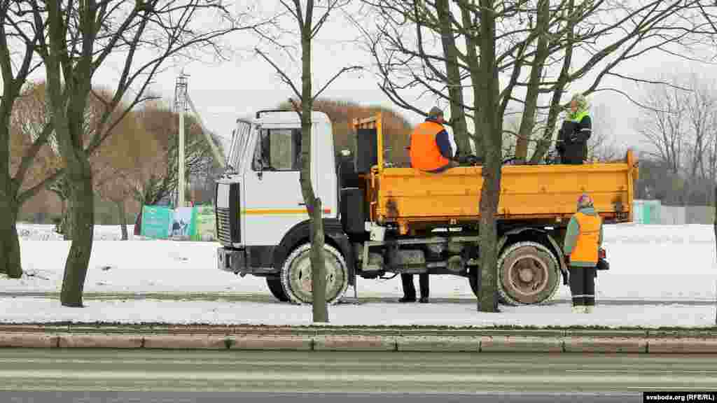 У Менску на праспэктах Незалежнасьці і Пераможцаў у аўральным парадку прыбіраюць сумёты і вычышчаюць праежджую частку.