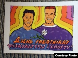 «У Дзень друку на паштоўцы Скарына трымае плякат са сваёй выявай. Вось Дзень работнікаў фізычнай культуры і спорту — там, напрыклад, такі шарж Сталонэ і Арнольд Шварцнэгер. Дзень памежніка — яшчэ адно савецкае сьвята. Тут на сваім працоўным месцы стаіць пагранічнік і салютуе, тое самае робіць ягоны сабака. То бок пільна сочаць, каб нічога не праскочыла варожае празь мяжу — ня тое, што асоба, а інфармацыя нейкая, не патрэбная беларускаму чалавеку», — распавёў Вольскі.