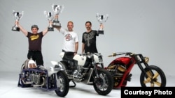 «І мы гэты крок зрабілі — не адразу, вядома, але пасьлядоўна ішлі да сваёй мэты. Напрыклад, у 2010-м, пяць гадоў таму, выйгралі чэмпіянат сьвету па матацыклетным кастамайзінгу ў Амэрыцы, ёсьць і такія спаборніцтвы. Гэта досыць шматэтапная гісторыя, у рамках якой спачатку праводзяцца рэгіянальныя чэмпіянаты, а ўжо ў фінале сустракаюцца шалёныя людзі з усяго сьвету, якія будуюць гэткія ж шалёныя матацыклы».