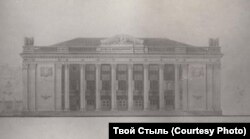 Вось так павінен быў выглядаць Палац Тэкстыльнікаў. Але абышліся без гербоў і сьцягаў. Праект 1956 г.