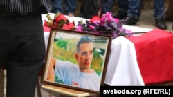 Труна Алеся пакрытая бела-чырвона-белым сьцягам. У грамадзе відаць бел-чырвона-белыя сьцягі і вянкі ў колерах украінскага сьцяга.