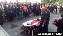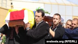 Калі прыехала машына зь целам, то сябры партыі БХД і маладафронтаўцы сталі на калені. Калі выносілі з машыны і раскрывалі труну, яны скандавалі: «Героі не ўміраюць!».