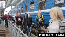 Цягнік зь беларускімі заўзятарамі прыбыў у Львоў. Радыё Свабода сустрэла заўзятараў на пэроне. Дзесяткі людзей у цішотках з Пагоняй адправіліся ў горад.