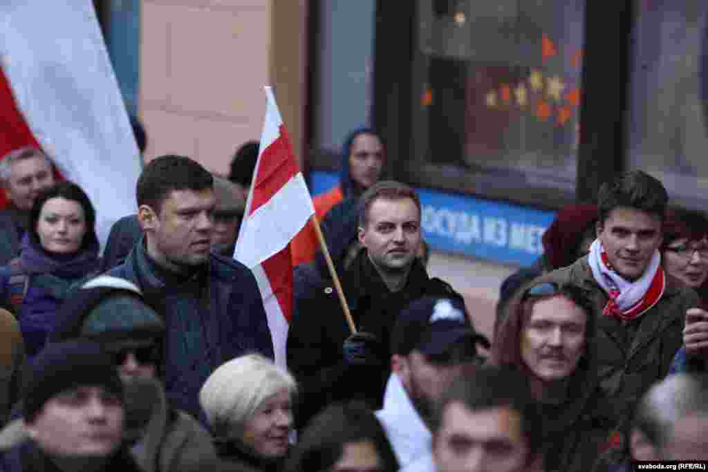 Ад 700 да 1000 чалавек узялі ўдзел у шэсьці нацыянальнага сьцяга, якое зарганізавалі апазыцыйныя лідэры. Шэсьце прайшло ад плошчы Свабоды да плошчы Якуба Коласа. Фота Радыё Свабода