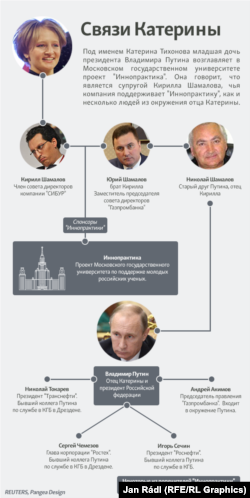 Андрэй Акімаў, старшыня праўленьня «Газпромбанку», паведаміў карэспандэнту Reuters, што сустракаўся з Кацярынай, якой цяпер 29 гадоў, яшчэ калі яна была дзіцем. Бачыў ён яе і ў менш аддаленыя часы. Паводле Акімава, Кацярына жыве пад прозьвішчам Ціханава (яе ідэнтычнасьць ўжо не аднойчы абмяркоўвалася ў СМІ і сацыяльных сетках — РС). Кацярына называе сябе жонкай Кірыла Шамалава, сына Мікалая Шамалава, даўняга сябра прэзыдэнта Пуціна. Шамалаў-старэйшы — акцыянэр банку «Россия», які амэрыканскія ўлады лічаць банкам расійскай эліты.
