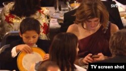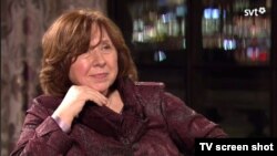 Месца першага беларускага нобэлеўскага ляўрэата — за чатыры крэслы ад прынцэсы Сафіі і за сем крэслаў ад караля Швэцыі Карла XVI Густава (ён сядзіць па іншы бок стала). А насупраць Сьвятланы Алексіевіч — міністар ў справах навукі Канады Крысьцін Дункан, прэм’ер-міністар Швэцыі Стэфан Лёвэн і сьпікер швэдскага парлямэнту Урбан Алін.