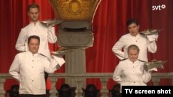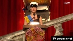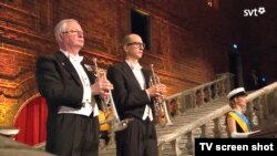 Зьлева ад Алексіевіч — Свантэ Лінквіст, рыксмаршал (кіраўнік прыдворнага ведамства) Швэцыі, а па правую руку ад пісьменьніцы — Міхаэль Сольман, былы выканаўчы дырэктар Нобэлеўскага фонду.