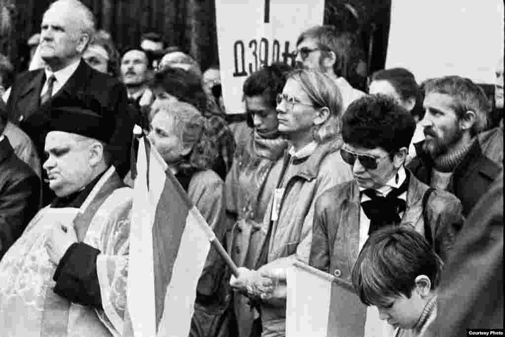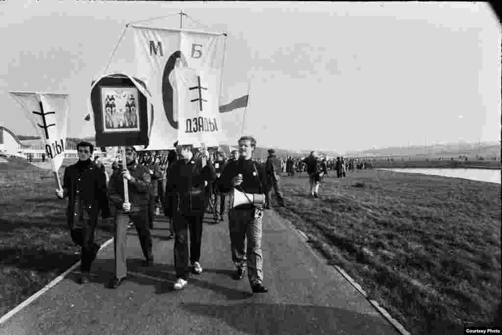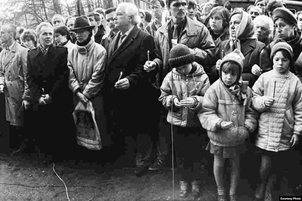 Сябры моладзевага аб’яднаньня «Талака» ўдзельнічаюць ва ўшанаваньні памяці продкаў на Дзяды. Курапаты, 1989 год. Архіўныя фота Ўладзіміра Сапагова.