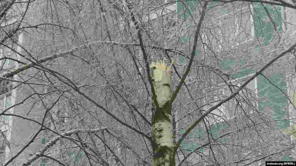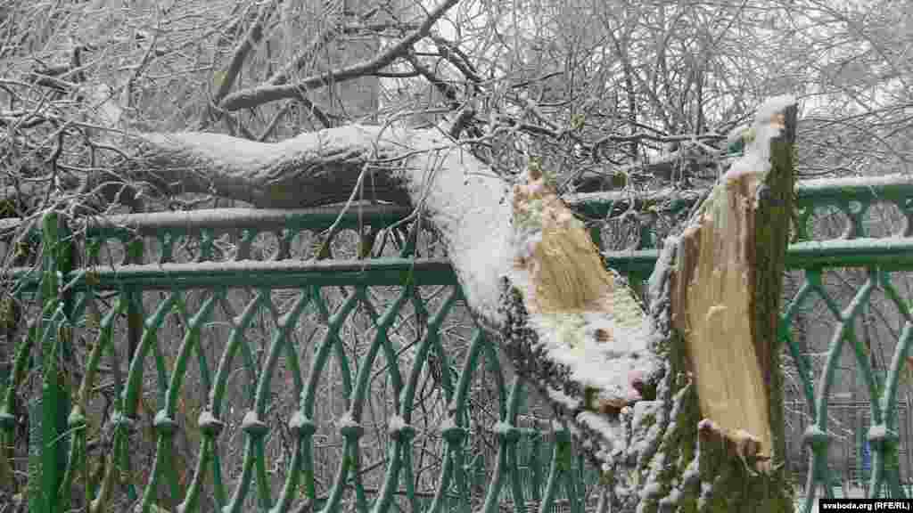 Пасьля ледзянога дажджу, які заліваў Бабруйск і ваколіцы ўсю ноч і раніцу, многія дрэвы ў горадзе не вытрымліваюць ледзянога цяжару. Цэлыя дрэвы і галіны пападалі, у тым ліку на аўтамабілі й лініі электраперадач.