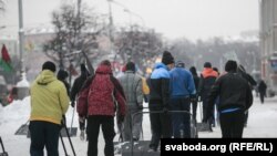 Хлопцы ў берцах прыбіраюць сьнег у Менску. Фотафакт