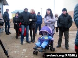 На вуліцы Агінскага, 27 у Горадні людзі сабраліся каля пабудаваных дамоў, у якія іх не засяляюць