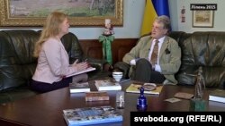 Мы запісваем гутарку, седзячы я на вялікай скураной канапе, ён — у крэсьле. У кадры — вялікі ўкраінскі сьцяг, на сьцяне партрэт Тараса Шаўчэнкі, недалёка вышытая ўкраінскім арнамэнтам карціна, праца былой зьняволенай ГУЛАГу.