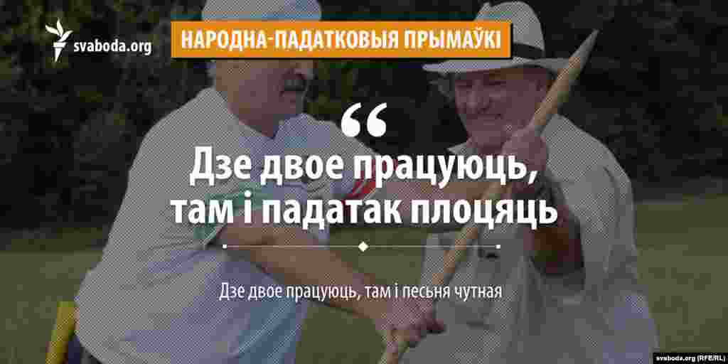 Гэта вядомыя народныя выразы накшталт «Хто ваўка баіцца, у ягады ня ходзіць», «Знай, каток, свой куток», «Гаспадарку весьці – не штанамі трэсьці», «Баба з калёс – каню сьвята», «Дзе двое працуюць, там і песьня чутная».