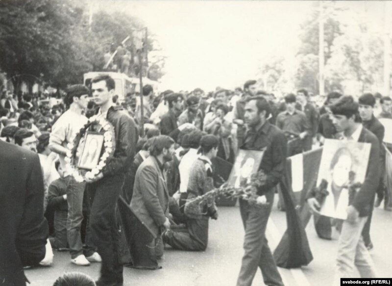 У 1989 годзе мяне накіравалі адразу ў Тбілісі, калі там АМАП ніжагародзкі пабіў людзей рыдлёўкамі. Мяне ўправа БНФ адправіла з афіцыйнай місіяй — выразіць спачуваньне і вызначыць, чым мы можам дапамагчы. І вось у каго трэба вучыцца салідарнасьці — я ніколі не забуду. Раніцай я прыходжу на праспэкт Руставэлі. Усё дрэвы абвязаныя чорнымі і чырвонымі жалобнымі стужкамі, сьвечы, вянкі, плямы крыві на асфальце — людзі ахоўваюць гэта, не падпускаюць нікога. Мітынг у цэнтры Тбілісі, каля Дома ўраду, Гамсахурдыя дае мне слова: «Прадстаўнік Беларускага Народнага Фронту Валер Сядоў». Я дастаю гэты сьцяг, і тут жа бура аплядысмэнтаў і авацыяў толькі сьцягу.
