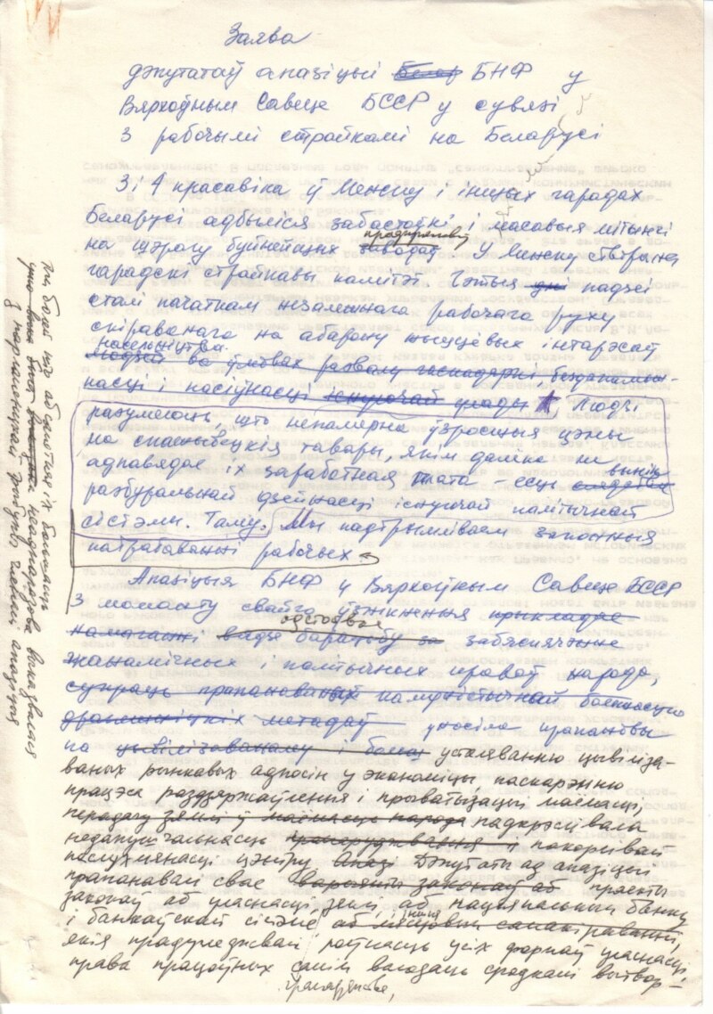 У мяне захаваўся чарнавік заявы Апазыцыі БНФ – пачатак напісаны рукой Голубева, працяг – маёй. Аднак проста заявіць пра неабходнасьць скліканьня пазачарговай сэсіі недастаткова, трэба сабраць подпісы дэпутатаў.