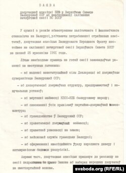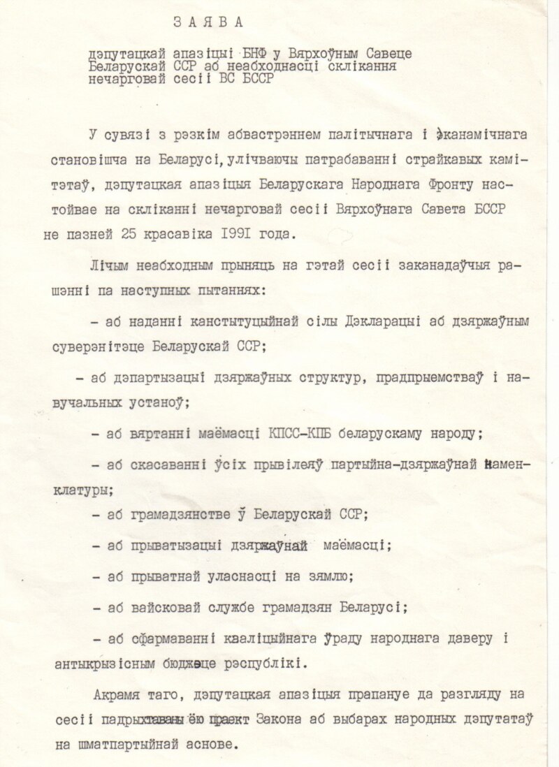 У Заяве мы патрабавалі скліканьня нечарговай сэсіі з наданьнем на ёй канстытуцыйнай сілы Дэклярацыі аб дзяржаўным сувэрэнітэце, прыняцьця рашэньняў аб дэпартызацыі, аб грамадзянстве Беларусі, аб прыватнай уласнасьці на зчямлю, аб вайсковай службе, а таксама аб сфармаваньні кааліцыйнага ўраду народнага даверу і аентыкрызысным бюджэце. Таксама, мы прапаноўвалі прыняць распрацаваны намі новы закон аб выбарах на шматпартыйнай аснове.