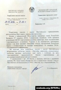 «Генэральная асамблея ААН прыняла рэзалюцыю 68/262, якая падтрымлівае тэрытарыяльную цэласнасьць Украіны ў яе міжнародна прызнаных межах і якая не прызнае зьмяненьняў статусу Аўтаномнай Рэспублікі Крым і горада Сэвастопаля па выніках праведзенага 16 сакавіка 2014 году агульнакрымскага рэфэрэндуму», — адпісалі з упраўленьня гандлю партыйцу, які дамагаецца, каб з магілёўскіх кнігарняў прыбралі з продажу глёбусы з «расейскім Крымам».