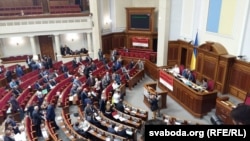 Надзея Саўчанка прыехала да парлямэнту на дзьве гадзіны раней, чым пачалося пасяджэньне, але ў сэсійную залю ўвайшла практычна ў апошнія хвіліны — у белай сарочцы і з украінскім сьцягам на плячах.