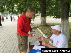 «Да афіцыйнай рэгістрацыі кандыдатам у дэпутаты агітаваць нельга. Таму людзей я не зазываю, але інфармацыя пра Губарэвіча — біяграфічныя зьвесткі, дзе працаваў, якая сям’я, дэвіз выбарчай кампаніі — зьмешчаная і на плякаце, і на аркушы паперы, які я паказваю падпісанту», — кажа сябра ініцыятыўнай групы Губарэвіча Зьміцер Трацьцяк.