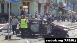 Скрыжаваньне вуліц Багдана Хмяльніцкага і Івана Франка ў Кіеве ачэпленае паліцыяй. На месцы працуюць праваахоўныя органы і СБУ. Відаць, што вокны аўтамабіля выбітыя, ён цалкам выгараў знутры.