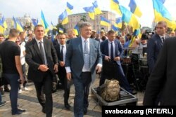 Ён падкрэсьліў, што нават у тыя часы знаходзіліся людзі, якія ўздымалі сьцяг над украінскімі гарадамі і вёскамі, за што многія былі арыштаваныя. Пятро Парашэнка выказаў упэўненасьць, што хутка ўкраінскі сьцяг ізноў будзе лунаць над Данецкам, Луганскам, Сімфэропалем, Сэвастопалем.