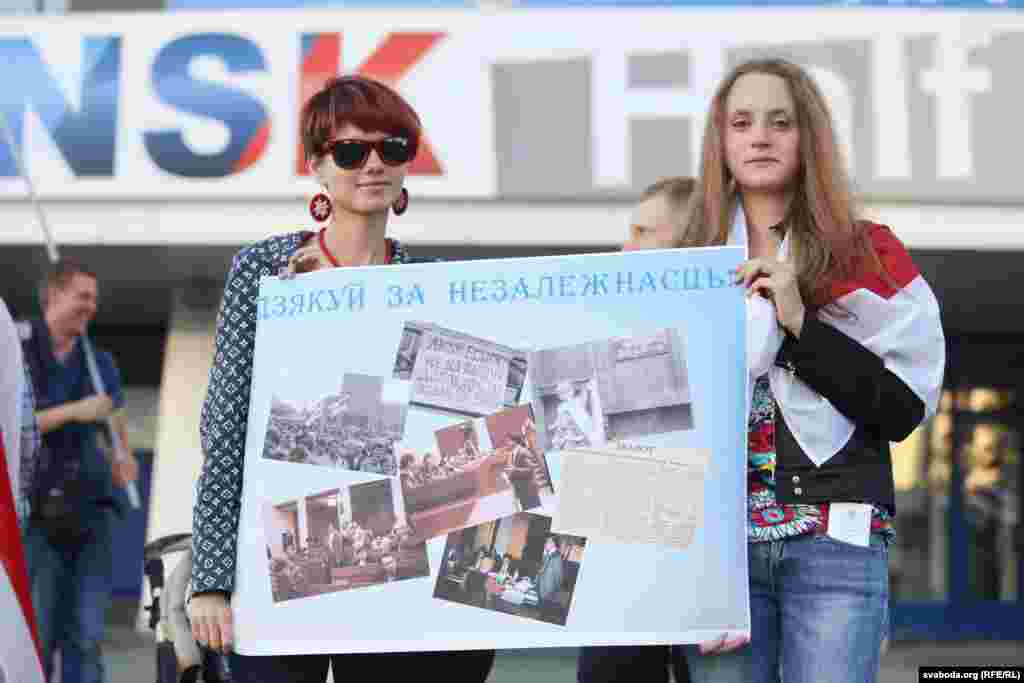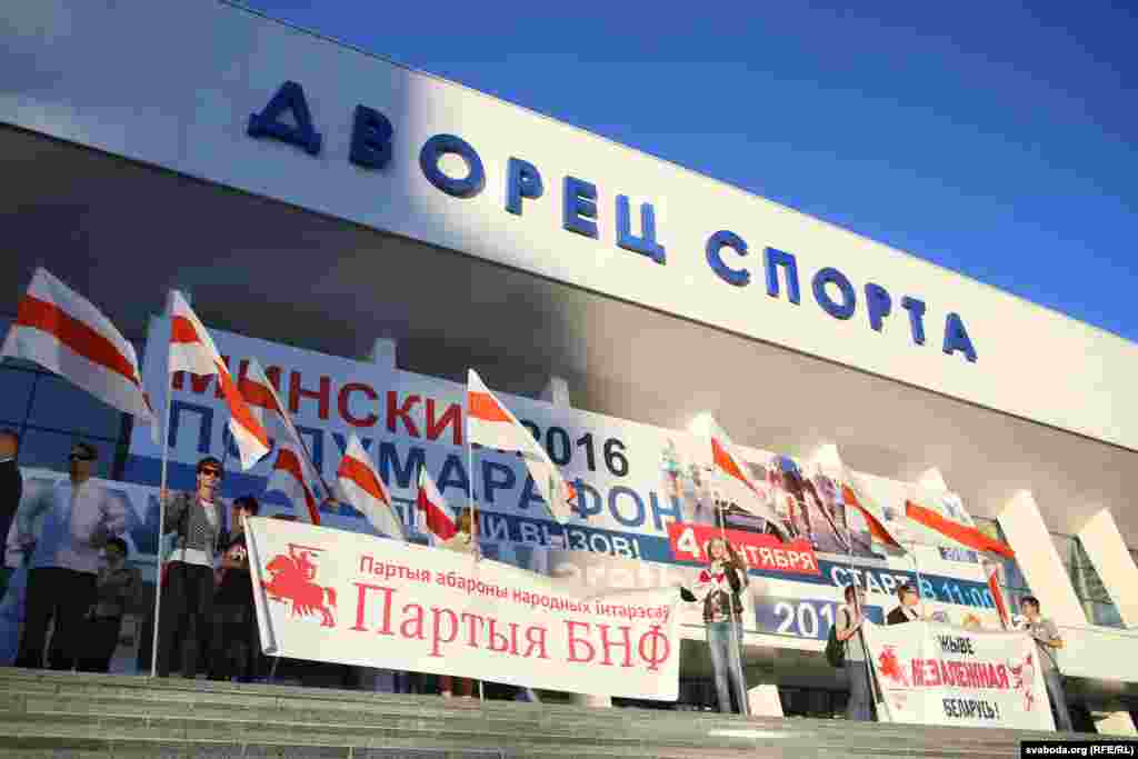 Каля менскага Палаца спорту адбыўся пікет Партыі БНФ. Некалькі дзясяткаў чалавек выйшлі пад бел-чырвона-белымі сьцягамі.