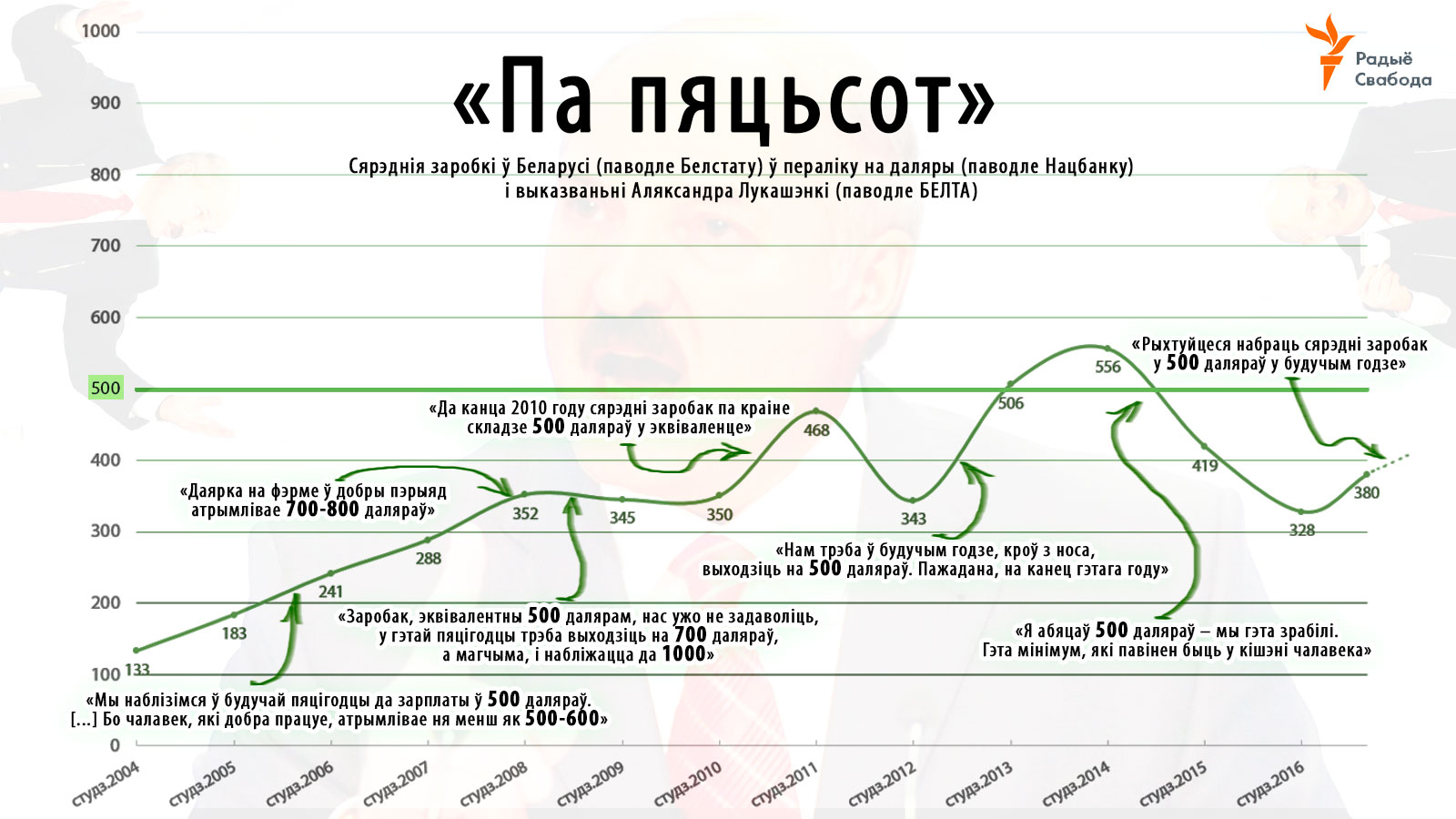 Аляксандар Лукашэнка ў час рабочай паездкі ў Магілёўскую вобласьць даручыў у 2017 годзе вярнуць сярэдні заробак на ўзровень 500 даляраў. На момант выказваньня сярэдні заробак у Беларусі складаў каля 386 даляраў.