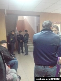 Родныя Івана Барбашынскага чакаюць, калі яго прывязуць у будынак суду. Сёньня тут узмоцненыя меры бясьпекі — на ўваходзе 5 міліцыянтаў.