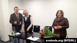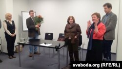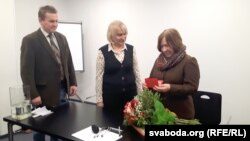 Рада Беларускай асацыяцыі журналістаў уручыла Сьвятлане Алексіевіч дыплём ганаровага сябра арганізацыі і пасьведчаньне Міжнароднай фэдэрацыі журналістаў.