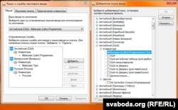 У ранейшых вэрсіях Windows на кнопку выбару мовы трэба націскаць ужо правай кнопкай мышы, абіраць «Парамэтры», побач са сьпісам раскладак націскаць «Дадаць», абіраць беларускую мову (альбо ангельскую, калі ўсталёўваеце лацінкавую раскладку) і адпаведную раскладку, націскаць ОК. І далей выдаляць непатрэбныя раскладкі і перазагружаць кампутар.